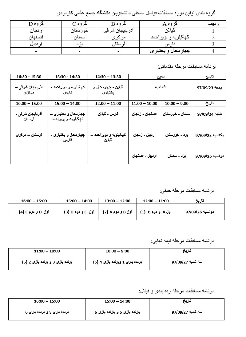 برنامه بازی ها و نتایج نخستین دوره مسابقات فوتبال ساحلی قهرمانی کشور دانشجویان دانشگاه جامع علمی کاربردی