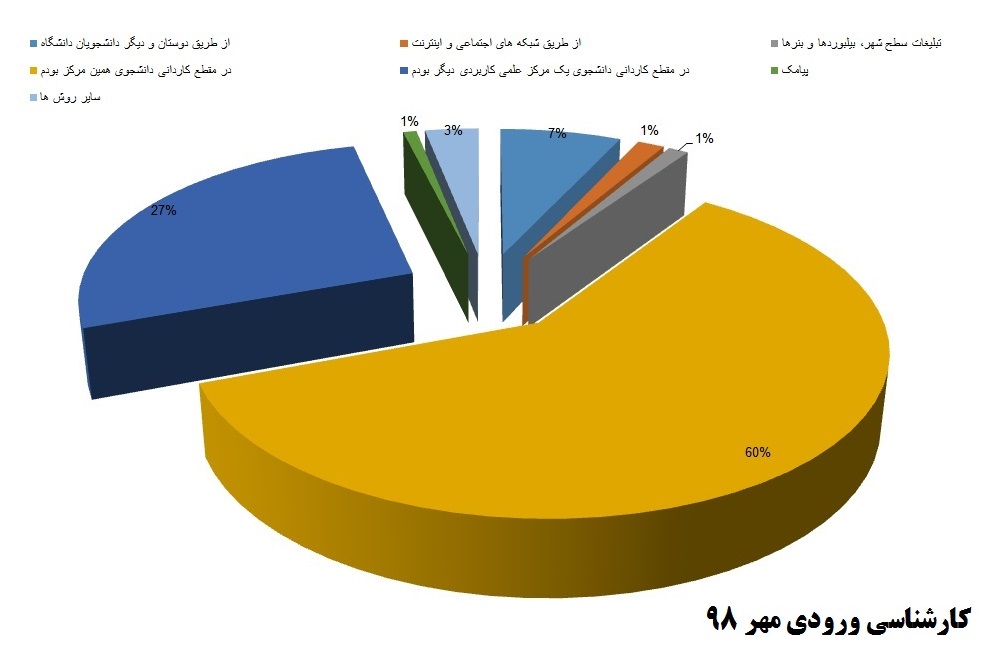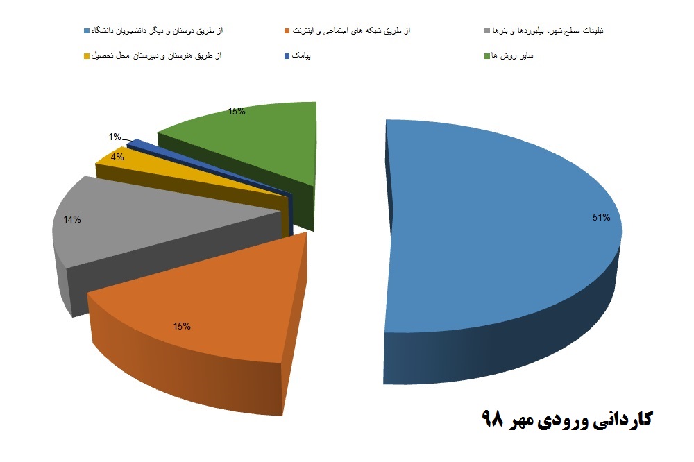 به گزارش روابط عمومی دانشگاه علمی کاربردی استان گیلان، براساس نتایج حاصل از نظرسنجی و جمع آوری اطلاعات از دانشجویان ورودی مهر 98 دانشگاه در مقاطع کاردانی و کارشناسی پس از دریافت بیش از 500 پرسشنامه از دانشجویان ورودی جدید دانشگاه در خصوص نحوه آشنایی با دانشگاه جامع علمی کاربردی، براساس پاسخ دانشجویان به این پرسش در مقطع کاردانی به ترتیب از طریق دوستان و دیگر دانشجویان دانشگاه 51 درصد از ورودی های جدید، از طریق شبکه های اجتماعی و اینترنت 15 درصد، تبلیغات سطح شهر، بیلبوردها و بنرها 14 درصد، از طریق هنرستان و دبیرستان محل تحصیل 4 درصد، پیامک 1 درصد و سایر روش ها 15 درصد تشویق به ثبت نام در دانشگاه جامع علمی کاربردی شده اند.